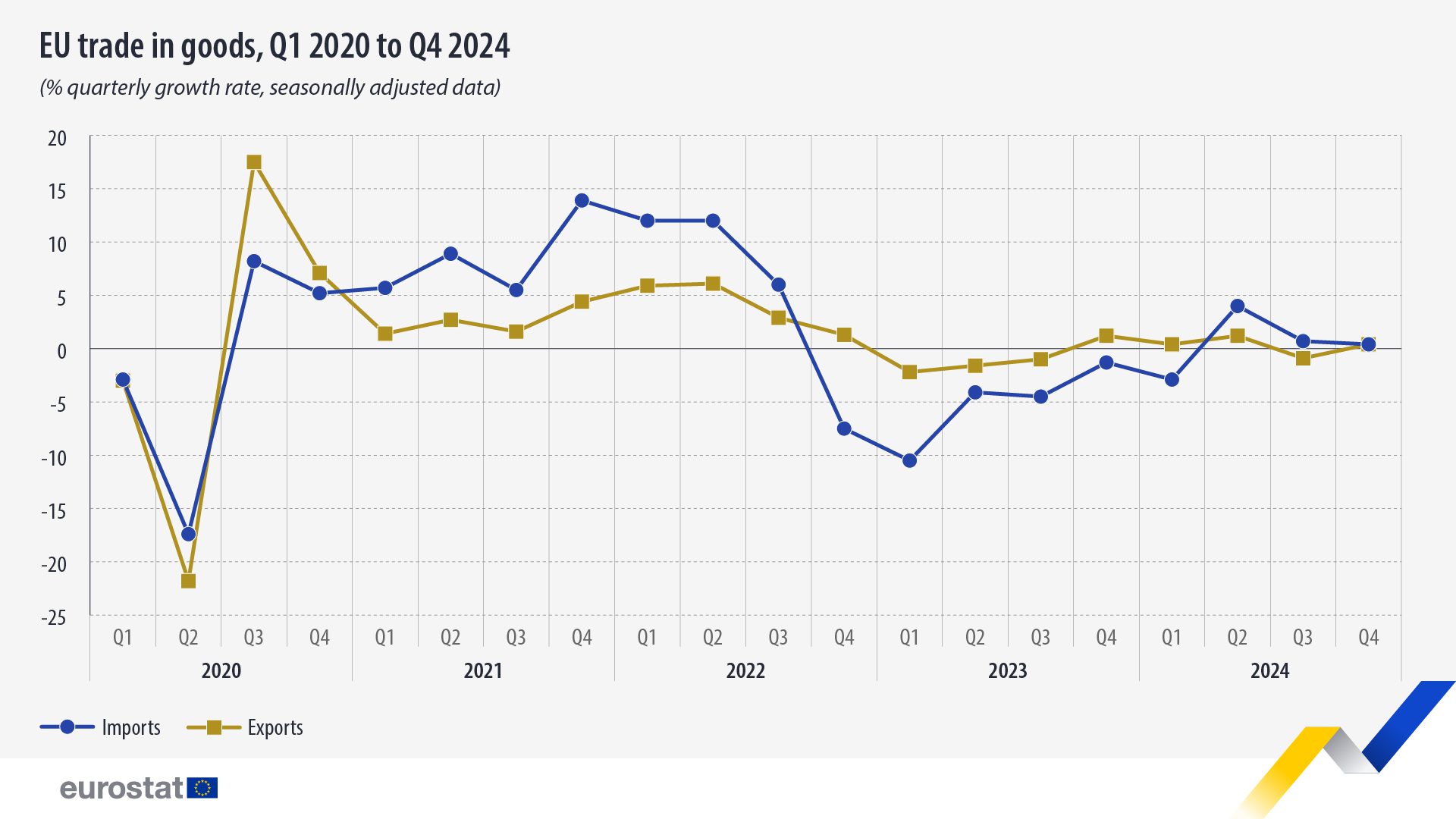 Según los datos de Eurostat, en el cuarto trimestre de 2024, tanto las exportaciones como las importaciones de bienes aumentaron un 0,4%. Fuente: Eurostat