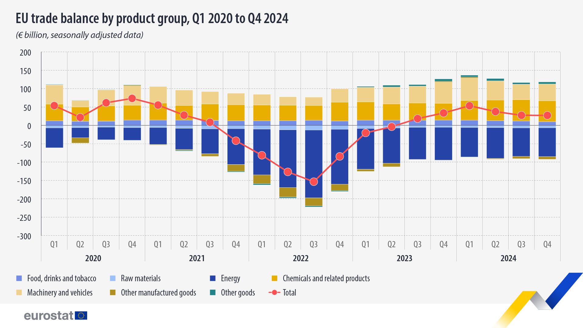 En el último trimestre de 2024, la UE exportó más bienes a países no pertenecientes a la UE de los que importó, lo que se tradujo en un superávit comercial de 27.200 millones de euros. Se trata del sexto trimestre consecutivo de una balanza comercial positiva, según informa Eurostat.