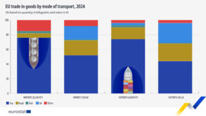 Según informa Eurostat, el transporte marítimo fue el principal modo de transporte para el comercio internacional de mercancías de la UE en 2024. Dominó el volumen físico del comercio, representando el 75,6 % de todas las importaciones y el 73,7 % de todas las exportaciones en peso. En términos de valor, representó una proporción menor, con el 51,3 % del valor de las importaciones y el 43,6 % del valor de las exportaciones.