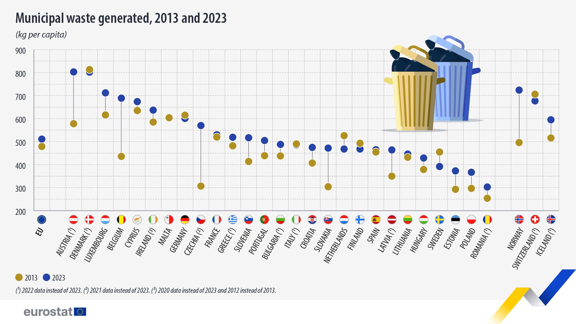 Por otro lado, la menor cantidad de residuos por persona se generó en Rumanía (303 kg), Polonia (367 kg) y Estonia (373 kg).
