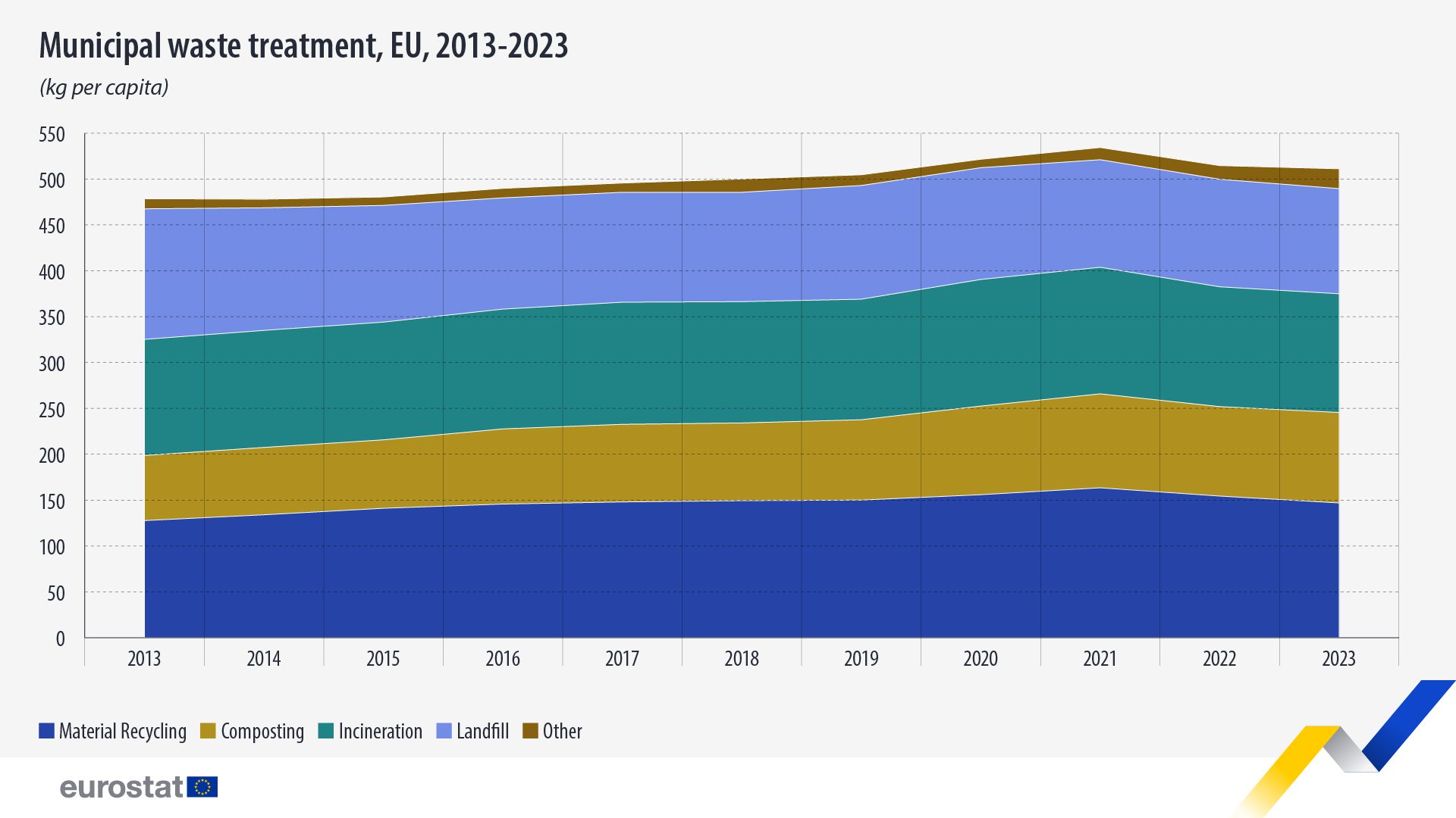En 2023, la cantidad de residuos municipales generados por persona en la UE ascendió a 511 kg, 4 kg menos que en 2022 (515 kg) y 23 kg menos que en 2021 (534 kg), según informa Eurostat.