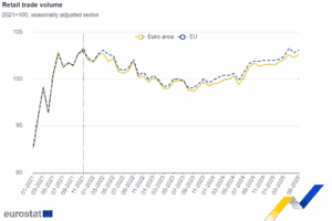 En junio de 2025, en comparación con mayo de 2025, el volumen del comercio minorista desestacionalizado aumentó un 0,3% tanto en la zona euro como en la UE , según las primeras estimaciones de Eurostat, la oficina estadística de la Unión Europea. En mayo de 2025, el volumen del comercio minorista disminuyó un 0,3% en la zona euro y un 0,5 % en la UE.