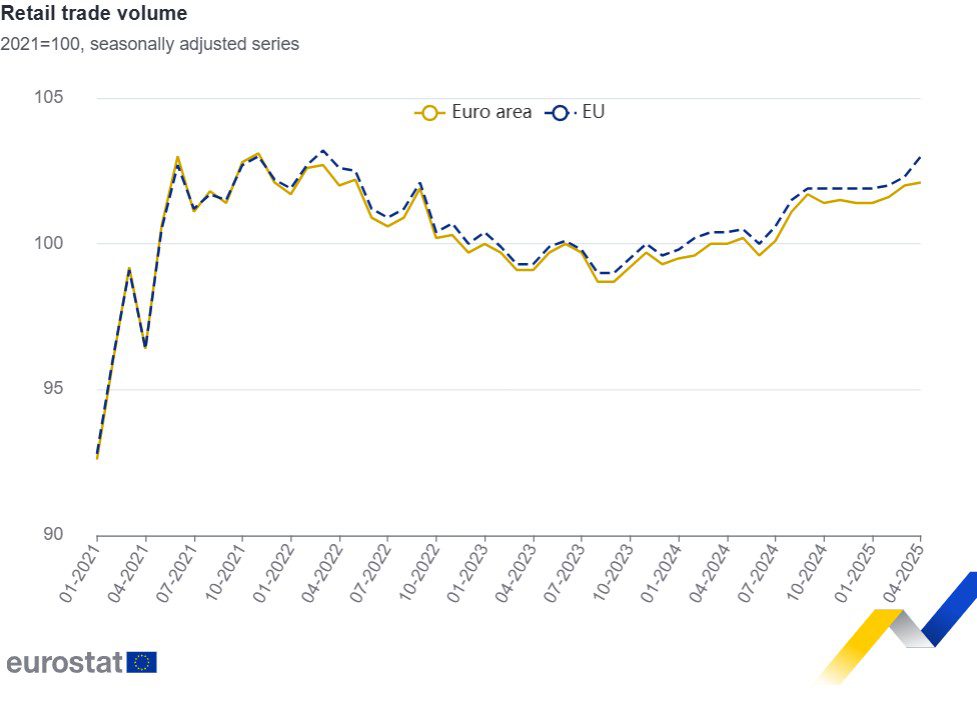 El volumen del comercio minorista desestacionalizado aumentó un 0,7 % en la UE y un 0,1 % en la zona euro en abril de 2025, en comparación con marzo de 2025, según los datos publicados por Eurostat.