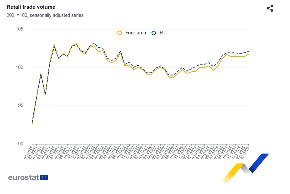 En febrero de 2025, en comparación con enero de 2025, el volumen de comercio minorista ajustado estacionalmente aumentó un 0,3% en la zona euro y un 0,2% en la UE, según informa Eurostat.