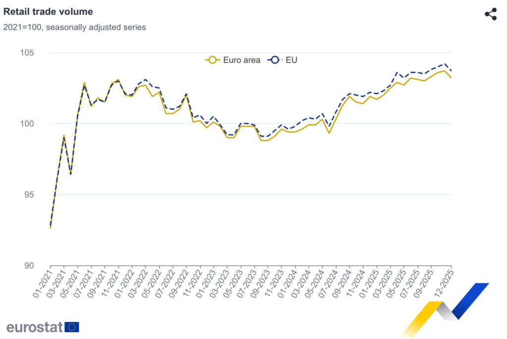 En diciembre de 2025, en comparación con noviembre de 2025, el volumen de comercio minorista ajustado estacionalmente disminuyó un 0,5 % tanto en la zona del euro como en la UE, según las primeras estimaciones de Eurostat, la oficina de estadísticas de la Unión Europea. En noviembre de 2025, el volumen del comercio minorista creció un 0,1 % en la zona del euro y un 0,2 % en la UE.