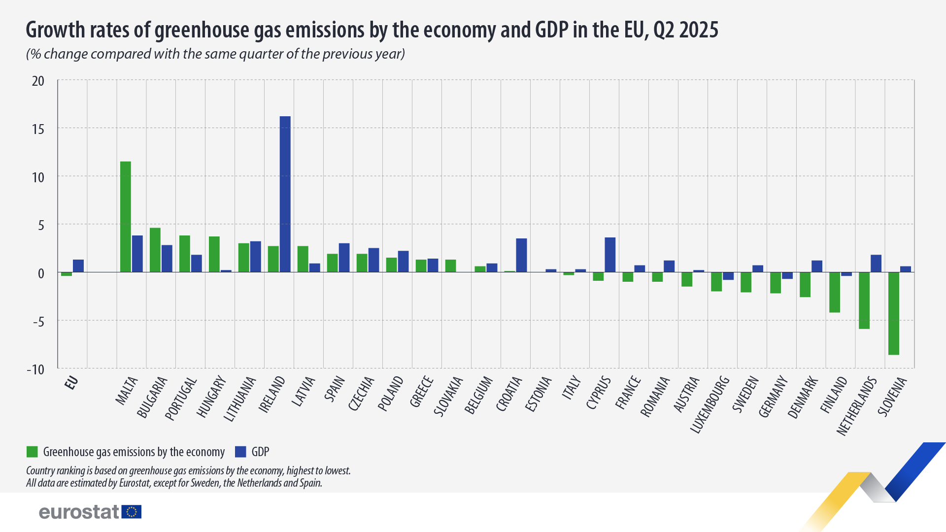 De los 12 países de la UE que registraron descensos en las emisiones de gases de efecto invernadero, 3 también experimentaron una disminución en su PIB (Finlandia, Alemania y Luxemburgo). Se estima que los otros 9 países de la UE (Austria, Chipre, Dinamarca, Francia, Italia, Países Bajos, Rumania, Eslovenia y Suecia) redujeron sus emisiones al tiempo que aumentaba su PIB.