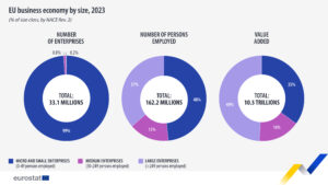 En 2023, había alrededor de 33,1 millones de empresas en la UE, que empleaban a 162,2 millones de personas. Estas empresas generaron una facturación neta de más de 38,5 billones de euros, lo que se tradujo en 10,5 billones de euros de valor añadido .