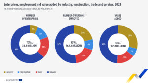 El sector servicios generó casi la mitad (49 %) del valor añadido total de la economía empresarial de la UE en 2023, la mayor proporción entre los cuatro sectores principales (industria, comercio, servicios y construcción). Con el 63 % del número total de empresas, empleó a más de la mitad de la fuerza laboral empresarial (52 %).