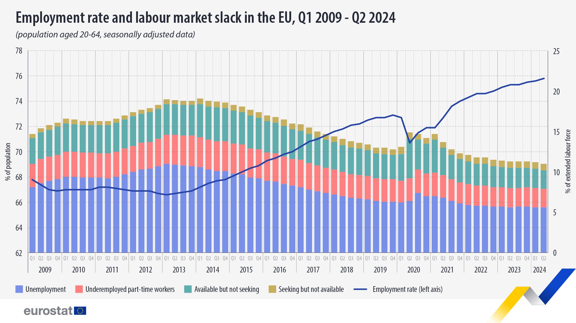 Según Eurostat, el mercado laboral que conforma a los desempleados ascendió al 11,0% del total de los trabajadores de entre 20 a 64 años en el segundo trimestre de 2024, un descenso del 0,1 en comparación al trimestre anterior.