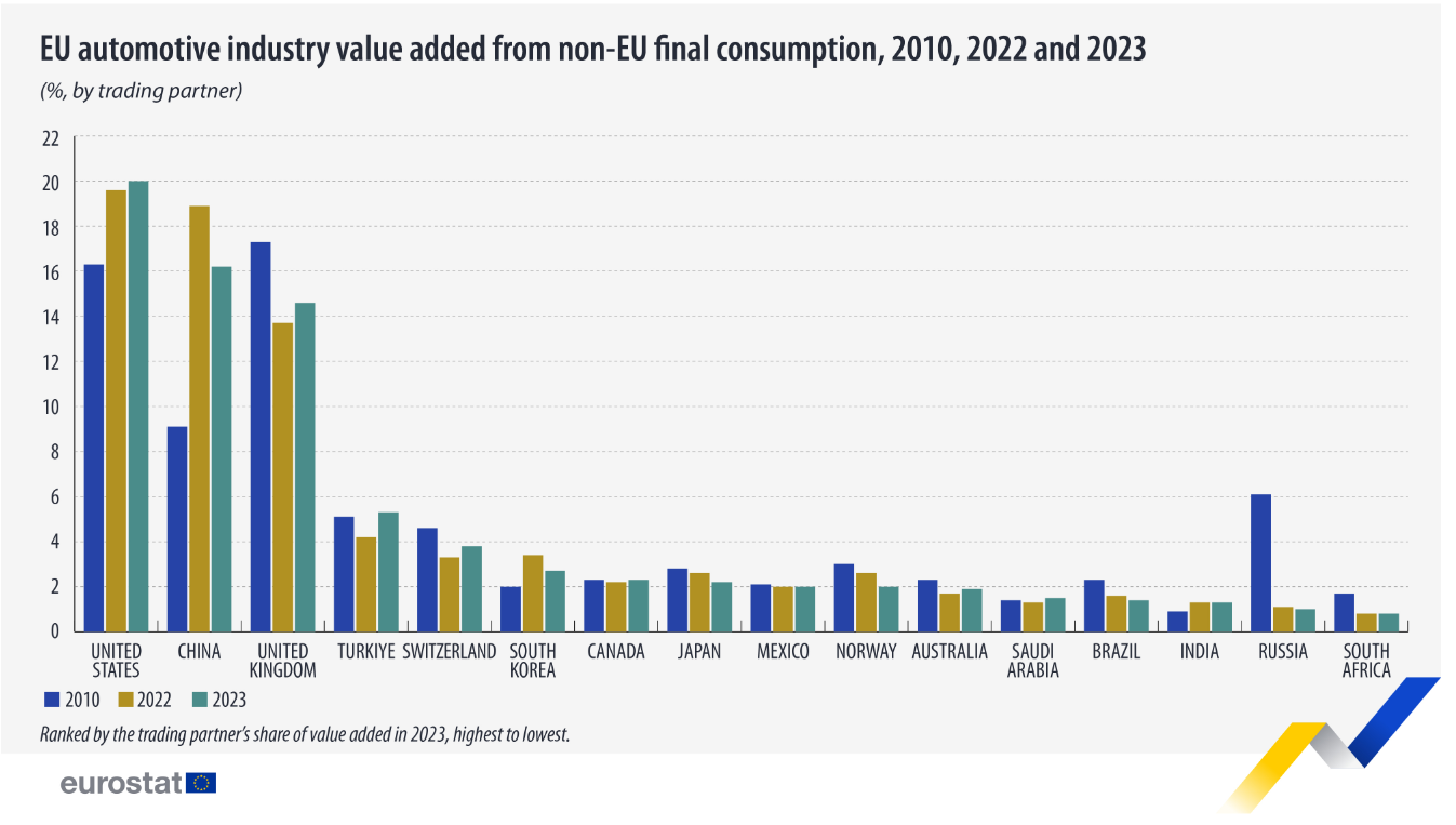 Estados Unidos fue el mayor consumidor de productos automotrices de la UE, representando el 20% del valor añadido interno total de la UE. China, que se ha convertido en un mercado importante para el sector automovilístico de la UE, vio crecer su participación del 9% en 2010 al 20% en 2021, pero volvió al 16% en 2023, lo que lo convirtió en el segundo mayor consumidor. El Reino Unido fue el tercer mercado más grande, aportando el 15% del valor añadido interno de la UE, según ha informado Eurostat.