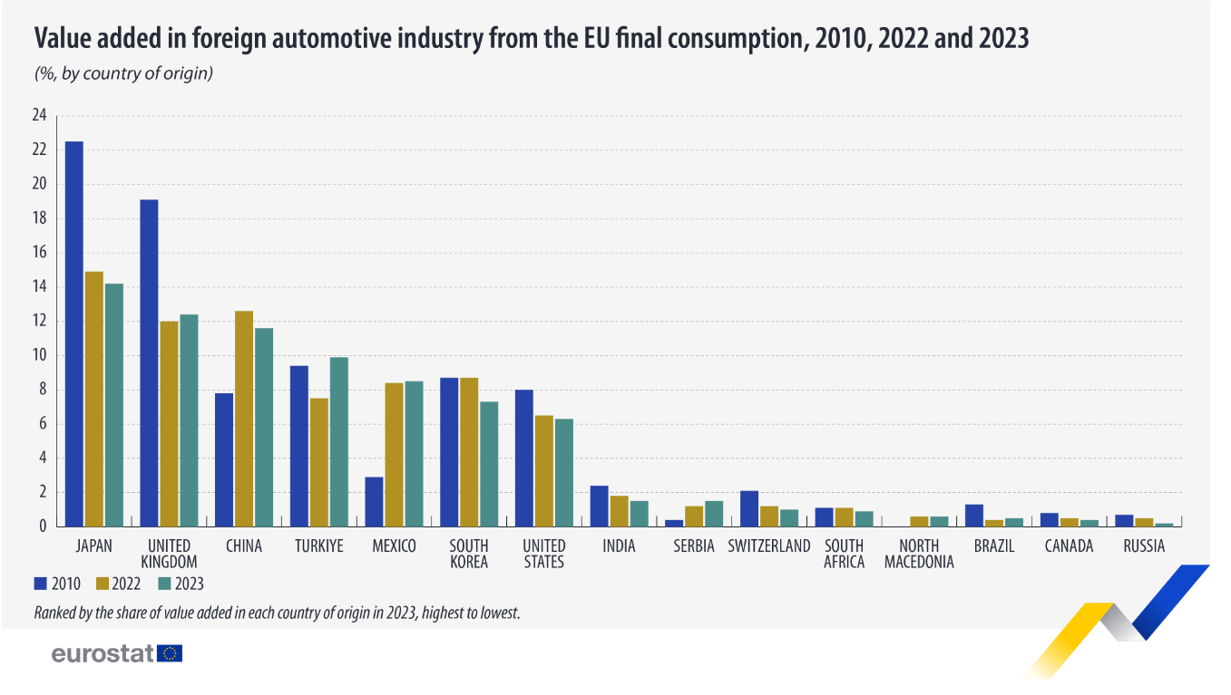 La mayor parte del valor añadido a la industria automovilística extranjera procedente del consumo de la UE se atribuyó a productores de Japón (14%), el Reino Unido y China (12% cada uno).