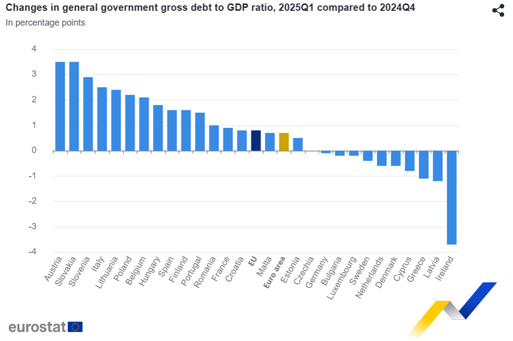 En comparación con el cuarto trimestre de 2024, dieciséis Estados miembros registraron un aumento de su ratio deuda/PIB al final del primer trimestre de 2025, diez registraron una disminución, y el ratio se mantuvo estable en Chequia . Los mayores aumentos del ratio se observaron en Austria y Eslovaquia (ambos +3,5 puntos porcentuales – pp), Eslovenia (+2,9 pp), Italia (+2,5 pp), Lituania (+2,4 pp), Polonia (+2,2 pp) y Bélgica (+2,1 pp). Los mayores descensos se registraron en Irlanda (-3,7 pp), Letonia (-1,2 pp) y Grecia (-1,1 pp).