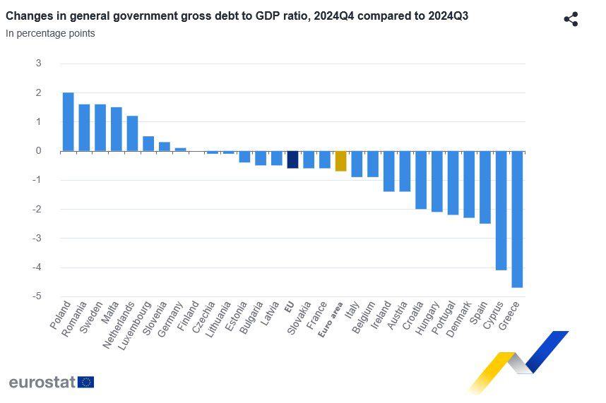 En comparación con el tercer trimestre de 2024, ocho Estados miembros registraron un aumento de su relación deuda/PIB al final del cuarto trimestre de 2024, dieciocho registraron una disminución, y la ratio se mantuvo estable en Finlandia.
