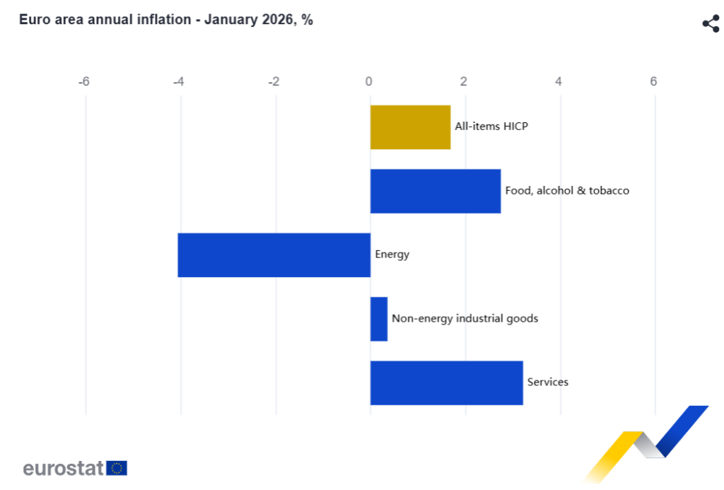 Se espera que la inflación anual de la zona del euro sea del 1,7 % en enero de 2026, frente al 2,0 % de diciembre, según una estimación preliminar de Eurostat, la oficina estadística de la Unión Europea .