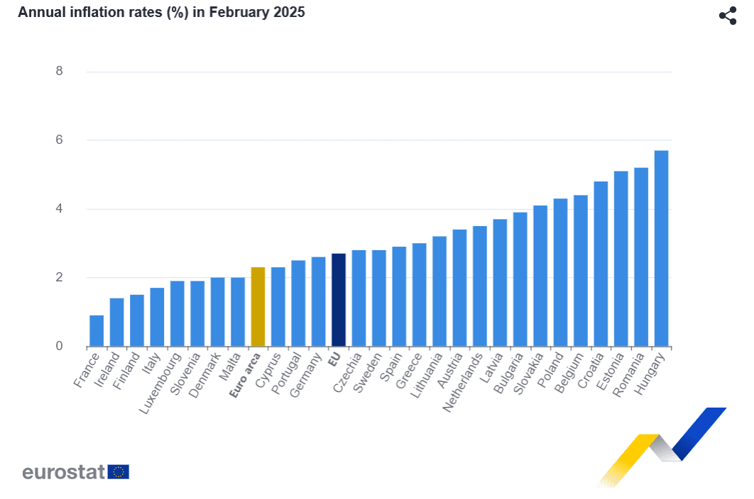 La inflación anual de la UE fue del 2,7% en febrero de 2025, frente al 2,8% de enero. Fuente: Eurostat