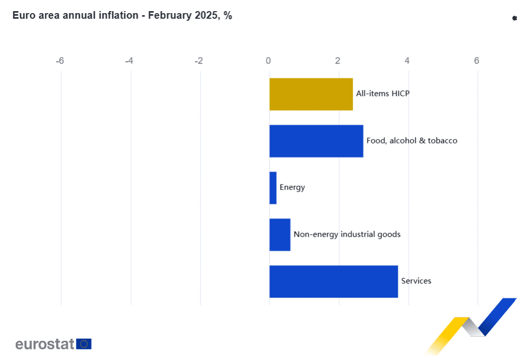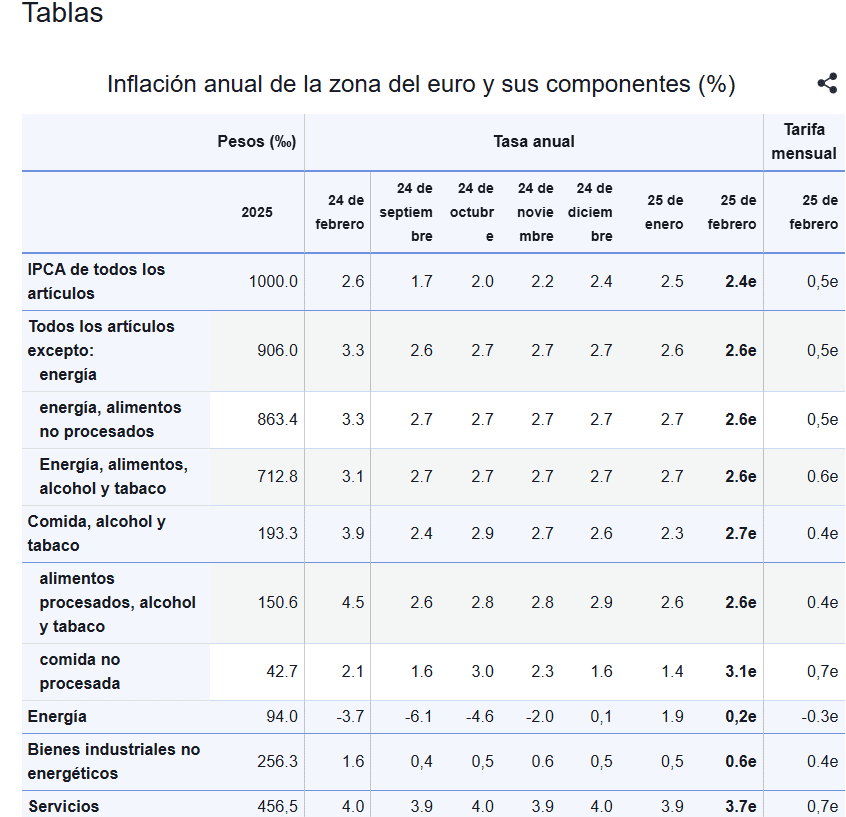 La inflación anual de la zona del euro se espera que sea del 2,4% en febrero de 2025, por debajo del 2,5% de enero, según una estimación preliminar de Eurostat, la oficina estadística de la Unión Europea .