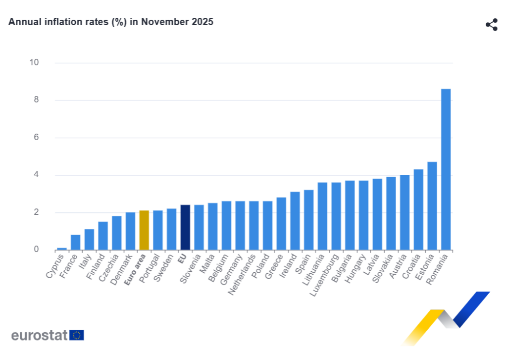 Las tasas anuales más bajas se registraron en Chipre (0,1 %), Francia (0,8 %) e Italia (1,1 %) . Las tasas anuales más altas se registraron en Rumanía (8,6 %), Estonia (4,7 %) y Croacia (4,3 %) . En comparación con octubre de 2025, la inflación anual disminuyó en doce Estados miembros, se mantuvo estable en cinco y aumentó en diez.