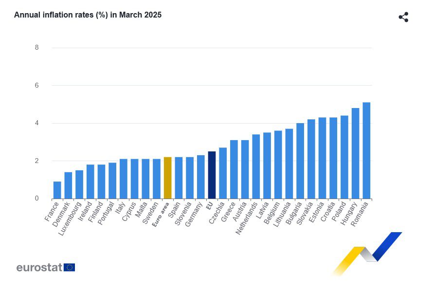 La tasa de inflación anual de la zona del euro fue del 2,2% en marzo de 2025, frente al 2,3% de febrero. Un año antes, la tasa era del 2,4%. La inflación interanual de la Unión Europea se situó en el 2,5% en marzo de 2025, frente al 2,7% de febrero. Un año antes, la tasa era del 2,6%, según informa Eurostat.