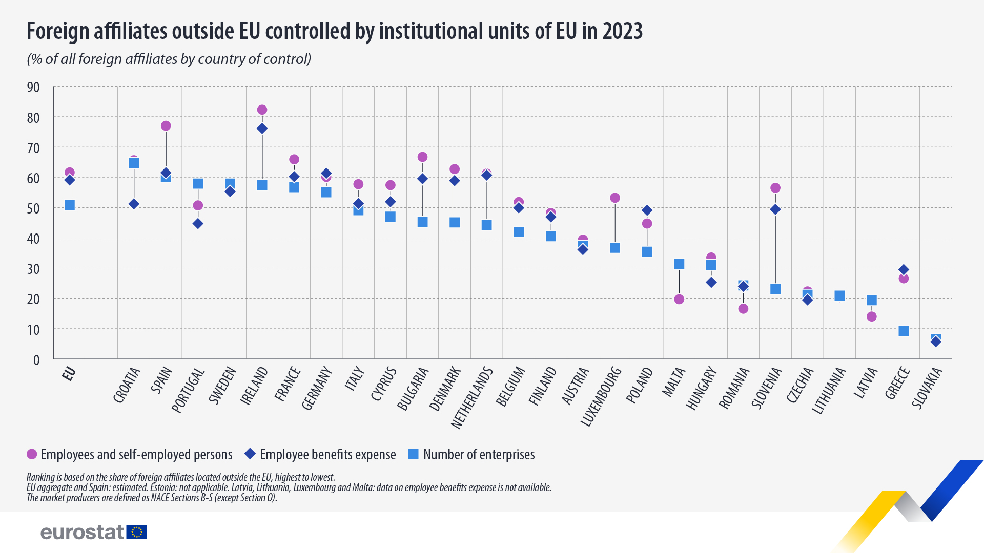 Las mayores cuotas de afiliados extranjeros activos fuera de la UE se informaron como empresas controladas por unidades institucionales residentes en Croacia (64,7 %), España (60,1 %), Portugal y Suecia (57,9 % cada una). Eslovaquia (6,6 %), Grecia (9,2 %) y Letonia (19,4 %) tuvieron las acciones más bajas.