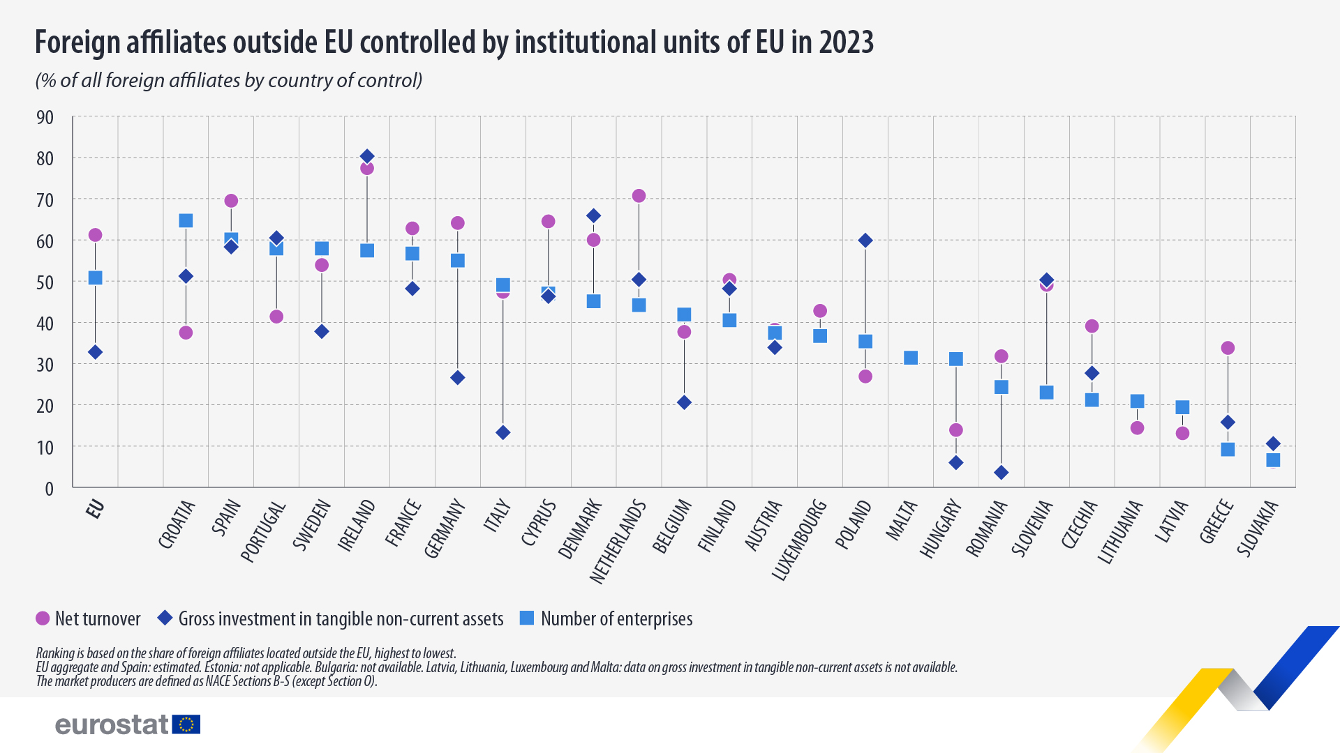 En 2023, el 61,2 % de la facturación neta de afiliados extranjeros controladas desde países de la UE se generó fuera de la UE. Las mayores cuotas de dicha facturación neta se registraron para afiliados controlados por Irlanda (77,4 %), los Países Bajos (70,7 %) y España (69,5 %). Las cuotas más bajas fueron para Eslovaquia (6,2 %), Letonia (13,1 %) y Hungría (13,9 %).