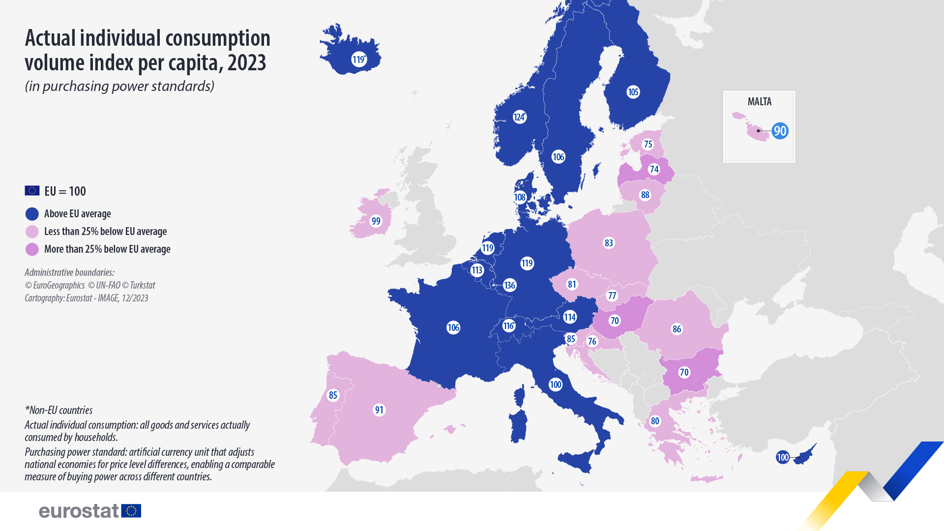 En 2023, los niveles de consumo individual real (AIC) en los países de la UE oscilaron entre el 70 % y el 136 % de la media de la UE, según informa Eurostat.