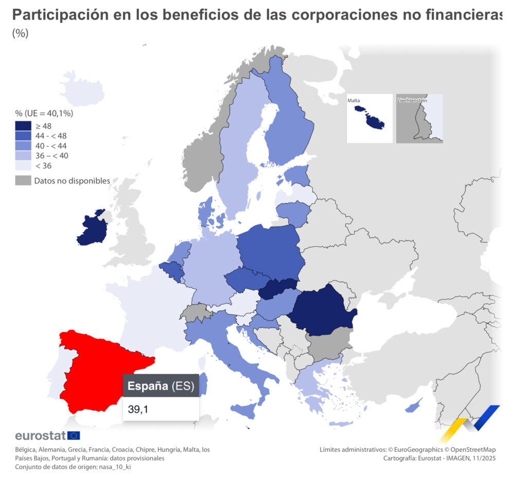 Entre los países de la UE, los valores más altos de participación en los beneficios en 2024 fueron en Irlanda (74,9 %), Malta (56,4 %) y Eslovaquia (48,9 %). El alto valor de Irlanda puede atribuirse a las grandes empresas multinacionales extranjeras ubicadas en el país, que tienen una alta intensidad de capital.