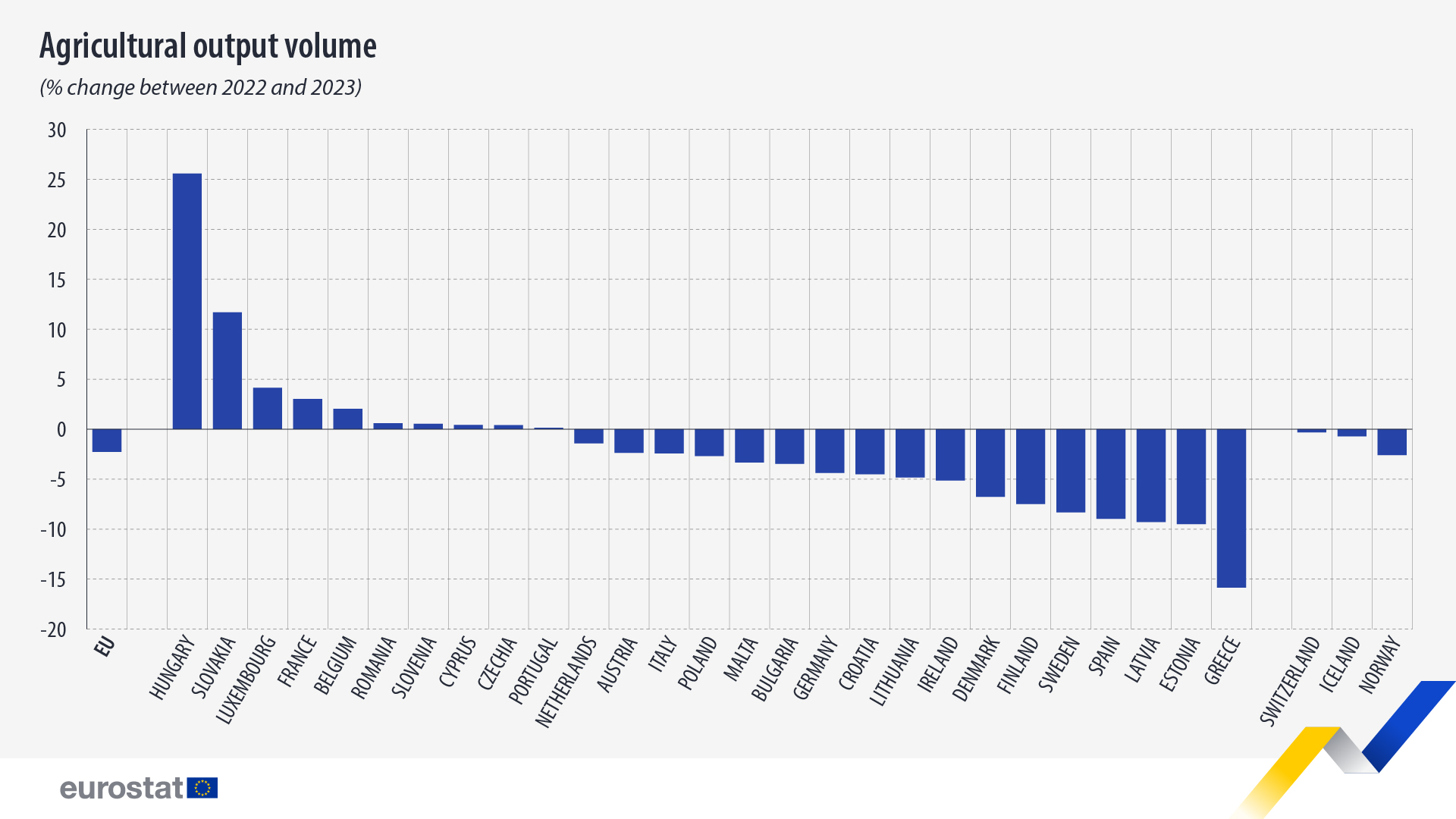 Aunque el volumen de la producción agrícola en la UE en 2023 fue ligeramente inferior al de 2022, hubo 10 países de la UE en los que los volúmenes fueron mayores. Las tasas de aumento más pronunciadas se registraron en Hungría (+26%) y Eslovaquia (+12%). En los demás países se registraron descensos, siendo los más pronunciados los de Grecia (-16%), Estonia, Letonia, España (cada uno -9%) y Suecia (-8%).