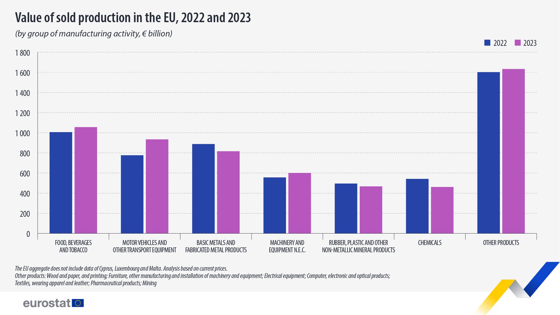 En términos nominales, el valor de la producción vendida de la UE aumentó de 5,895 mil millones de euros en 2022 a 5,992 mil millones de euros en 2023, lo que indica un aumento del 1,6%.