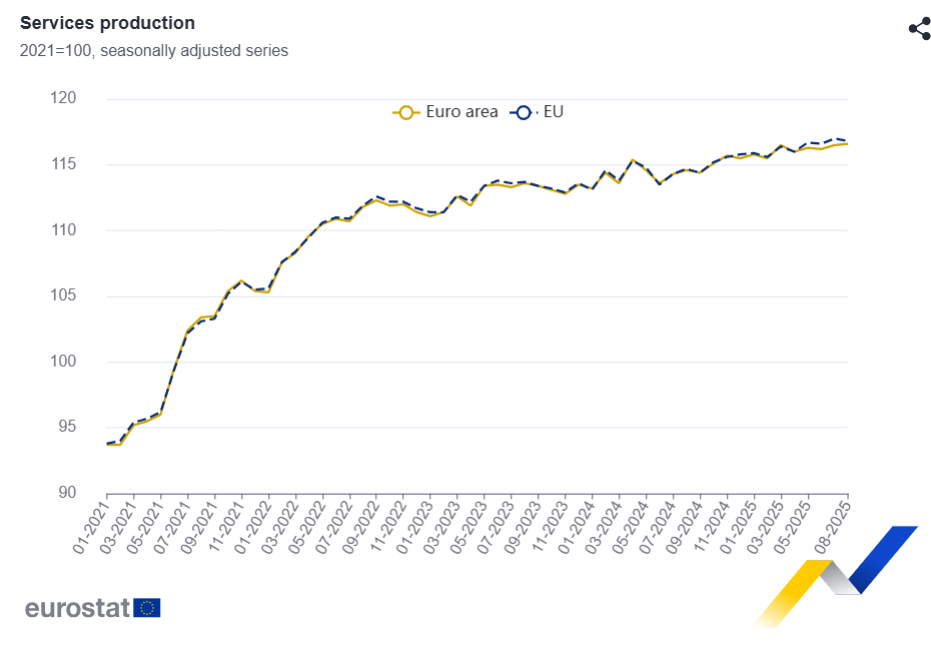 En agosto de 2025, en comparación con agosto de 2024, la producción de servicios aumentó un 1,7% en la zona euro y un 1,8% en la UE .