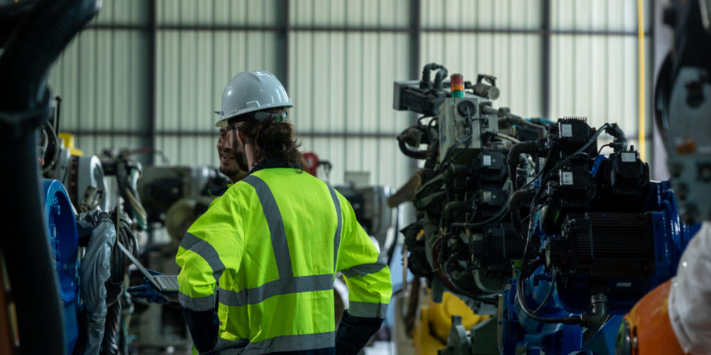 Engineer and mechanic worker checking and maintain industrial robot arm controller inside the factory.