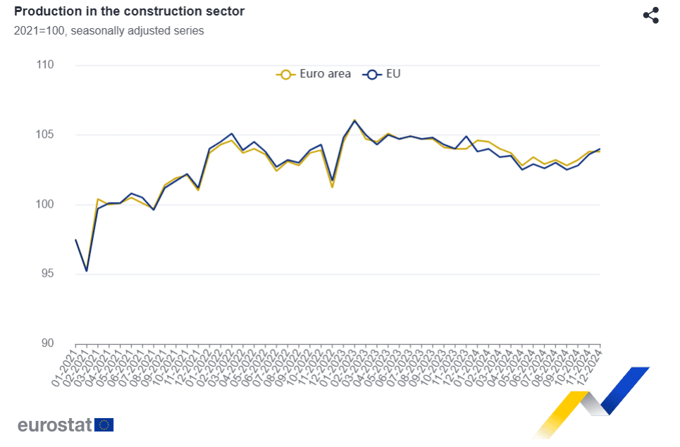 El pasado diciembre, en comparación con noviembre de 2024, la producción desestacionalizada de la construcción se mantuvo estable en la eurozona y aumentó un 0,4% en la UE, según informa Eurostat.