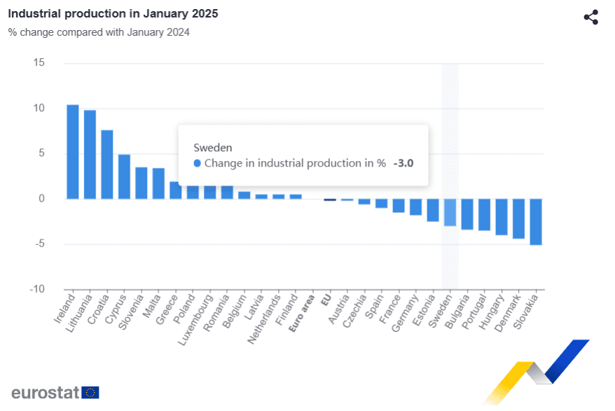 Por otro lado, en enero de 2025, en comparación con enero de 2024, la producción industrial se mantuvo estable en la eurozona y disminuyó un 0,2% en la UE.