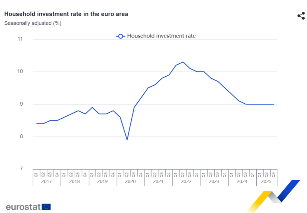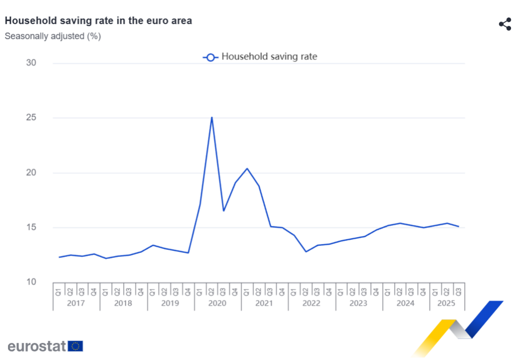 La tasa de ahorro de los hogares en la zona del euro disminuyó al 15,1 % en el tercer trimestre de 2025 (en comparación con el 15,4 % en el segundo trimestre de 2025), lo que se explica por un aumento del consumo a un ritmo más rápido que el ingreso bruto disponible (respectivamente +0,9 % y +0,6 %).
