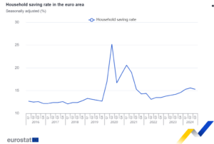La tasa de ahorro de los hogares de la zona del euro se situó en el 15,3% en el tercer trimestre de 2024 (frente al 15,6% en el segundo trimestre de 2024), lo que se explica por un aumento del consumo del 1,1%, a un ritmo más rápido que la renta bruta disponible (+0,7%).