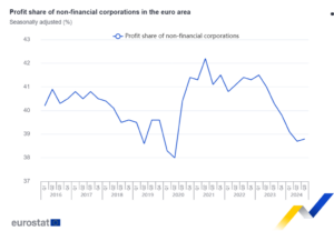 En el tercer trimestre de 2024, la participación de las empresas (sociedades no financieras) en los beneficios aumentó ligeramente del 38,7% al 38,8% en la zona del euro , lo que se explica por el aumento de la remuneración empresarial de los asalariados (salarios y cotizaciones sociales) más impuestos menos subvenciones a la producción en un 1,2%, a una tasa ligeramente inferior al valor añadido bruto (+1,4%).