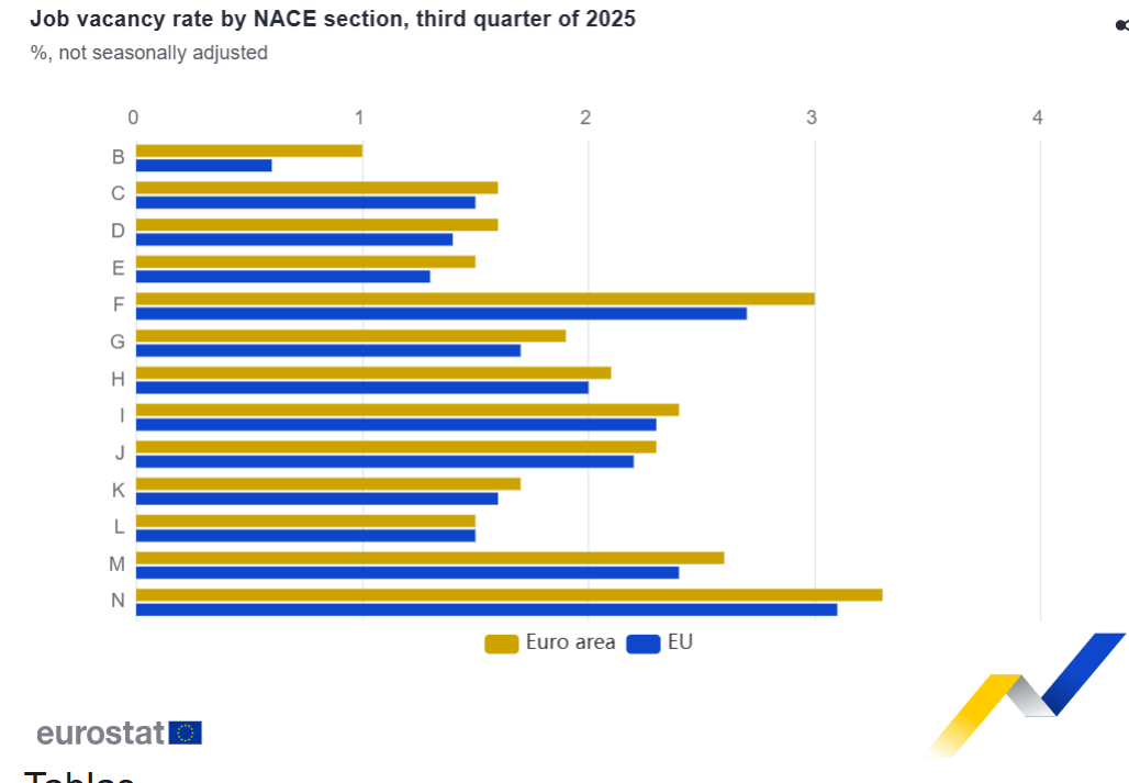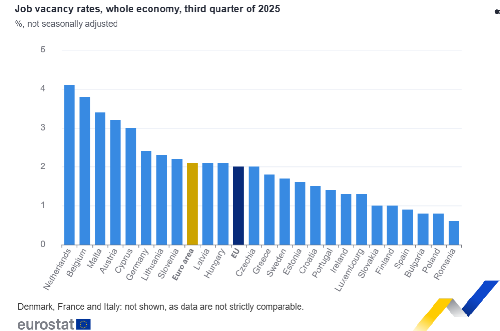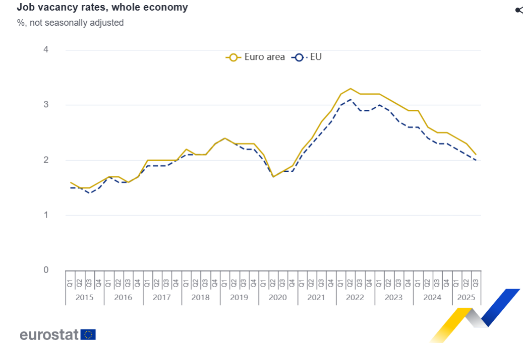 La tasa de vacantes de empleo en la UE fue del 2,0 % en el tercer trimestre de 2025, una disminución respecto al 2,1 % del segundo trimestre de 2025 y al 2,3 % del tercer trimestre de 2024.