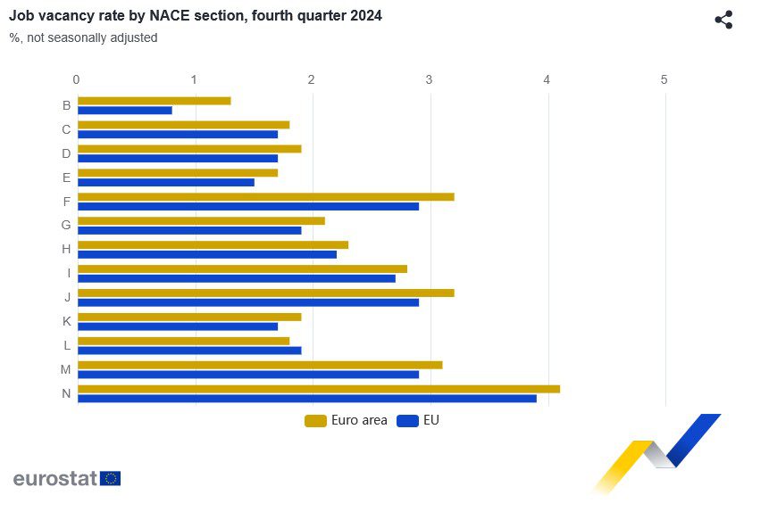 En el cuarto trimestre de 2024, la tasa de vacantes de empleo fue del 2,5% en la zona euro, sin cambios respecto al tercer trimestre de 2024 y frente al 2,9% del cuarto trimestre de 2023, según informa Eurostat.