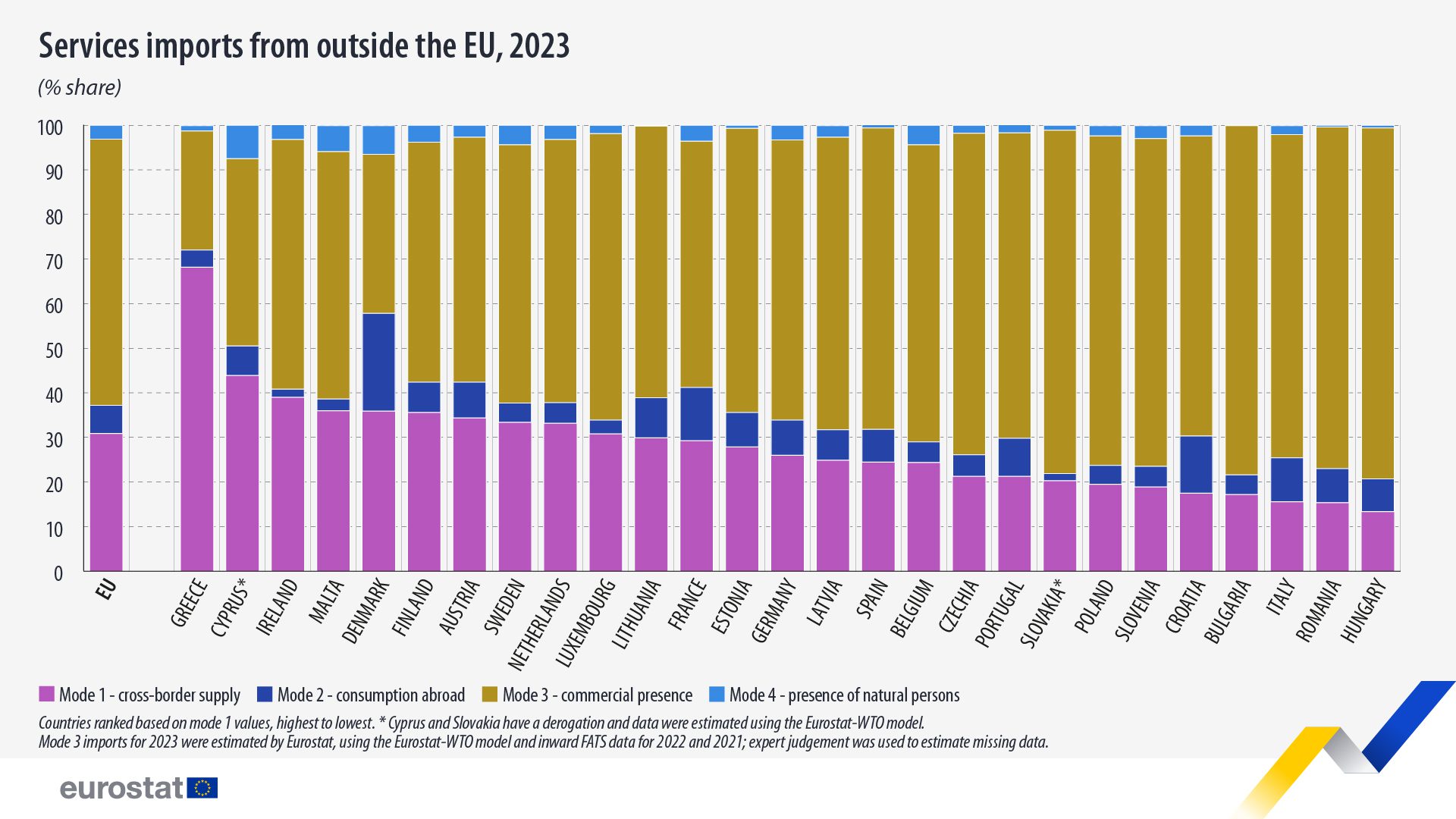 Los datos señalan que el 60% (1.996.000 millones de euros) de las importaciones de servicios de la UE estaban relacionadas con la presencia comercial, el 31% (1.030.000 millones de euros) con el suministro transfronterizo, el 6% (0,215 000 millones de euros) con el consumo en el extranjero y el3 % (0,103 000 millones de euros) con la presencia de personas físicas.