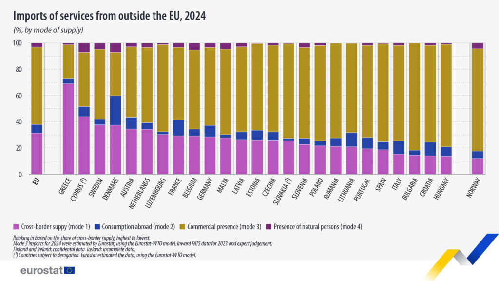 El suministro transfronterizo (modo 1) fue el modo dominante en Grecia, representando el 68,8 % de las importaciones. Chipre (43,8 %), Suecia (37,7 %) y Dinamarca (37,4 %) también reportaron altas cuotas.
