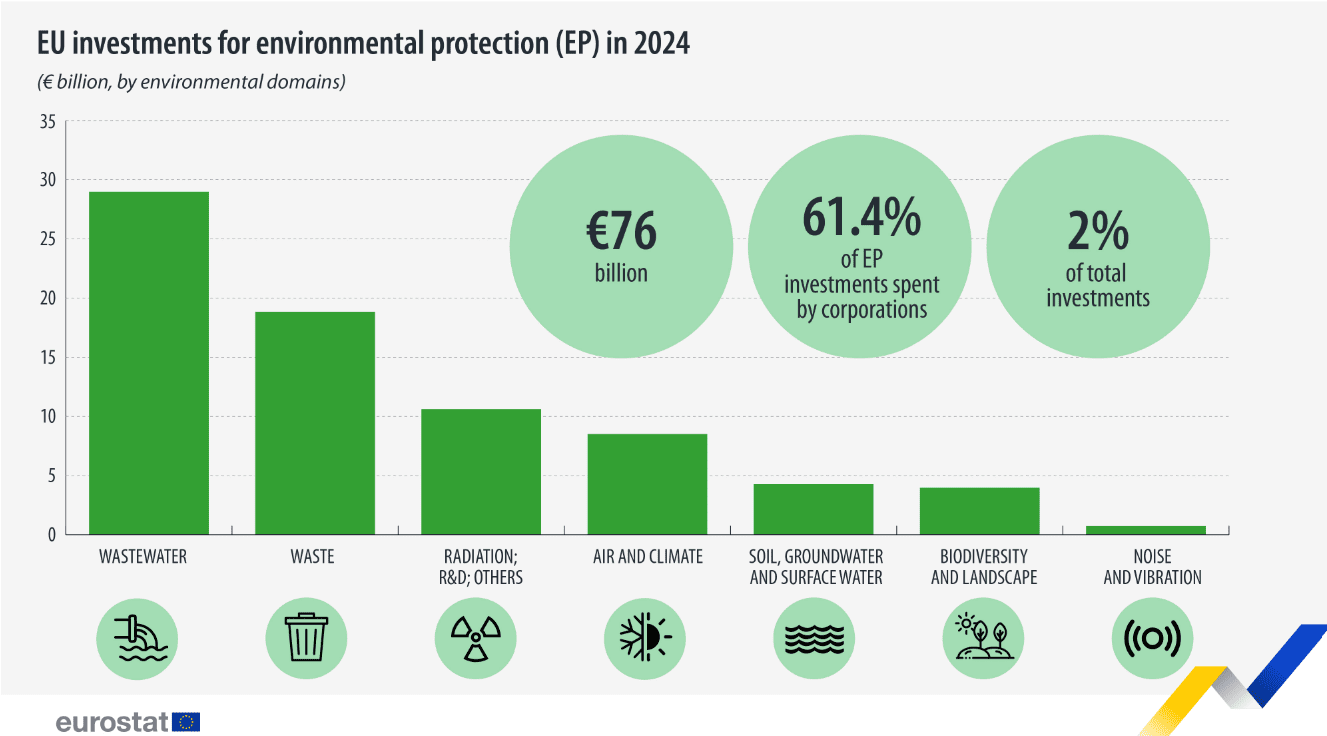 Los países de la UE invirtieron alrededor de 76.000 millones de euros en activos esenciales para la prestación de servicios de protección ambiental durante 2024. Estos servicios incluyen plantas de tratamiento de aguas residuales, vehículos para el transporte de residuos, adquisiciones de terrenos para crear reservas naturales y equipos de producción más limpios.