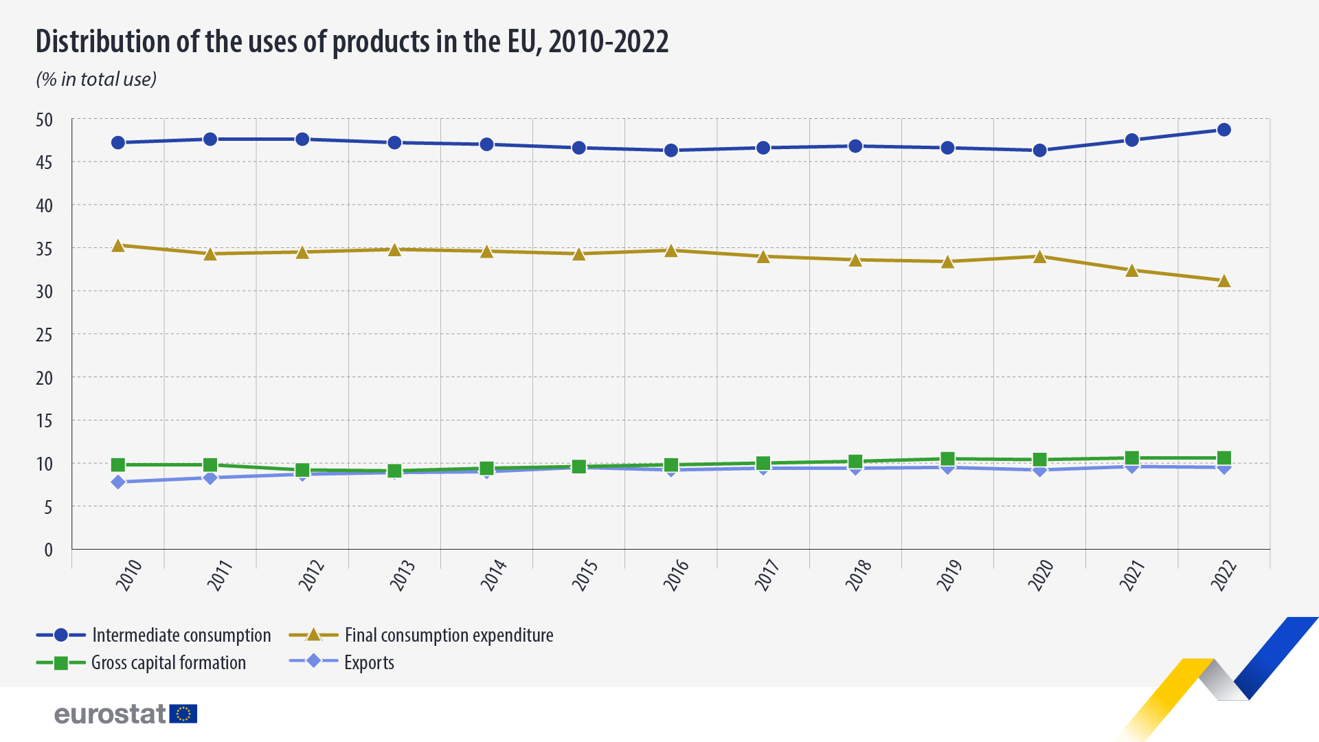 Eurostat señala que, a partir de 2020, el consumo intermedio inició una tendencia ascendente que culminó en 2022 con un 48,7%. Por otro lado, la proporción del gasto de consumo final en la oferta total fue más alta en 2010, con un 35,3%, y disminuyó lenta y constantemente hasta el 31,2% en 2022.