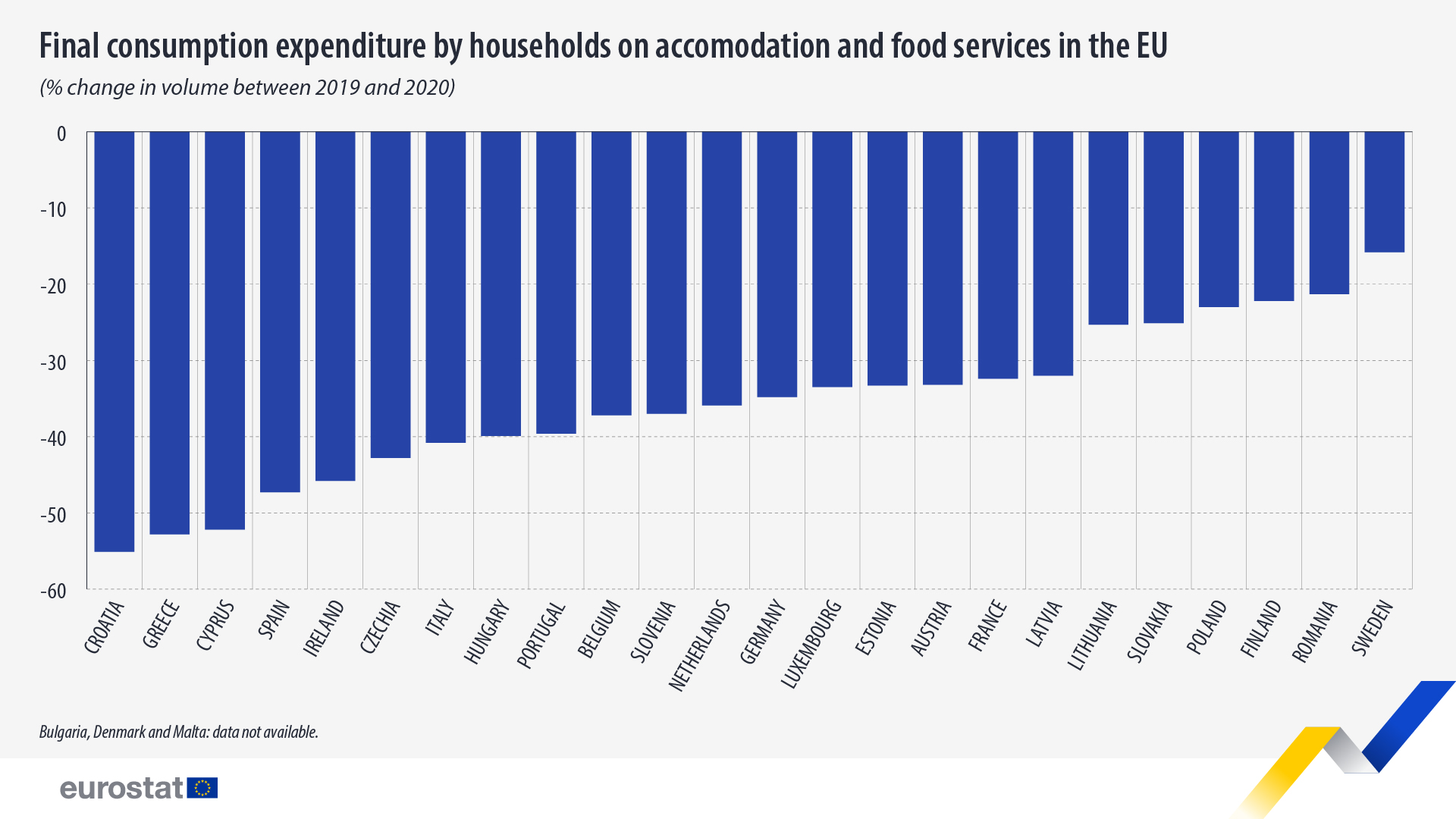 Los datos de Eurostat informan que, tras la pandemia del COVID-19, el consumo final de estos servicios por parte de los hogares cayó más del 50% en Croacia, Grecia y Chipre, mientras que Suecia registró el menor descenso (-16%) entre los países de la UE, seguida de Rumanía (-21%), Finlandia (-22) y Polonia. (-23%).