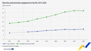Según informa Eurostat, entre 2015 y 2023, los AEE comercializados en la UE crecieron un 78 %, pasando de 18,1 kg por persona en 2015 a 32,2 kg en 2023.