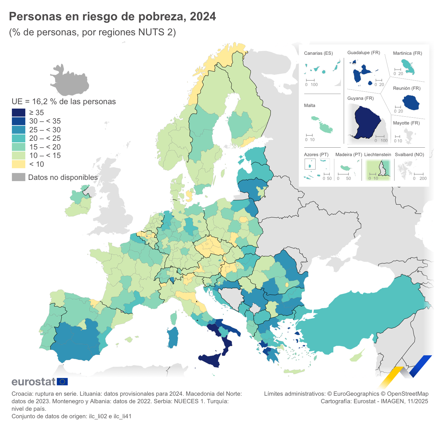 A nivel regional, 10 regiones del nivel 2 de la nomenclatura de unidades territoriales para las estadísticas (NUTS 2) de la UE tenían una proporción de personas en riesgo de pobreza superior al 30 %, según informa Eurostat.