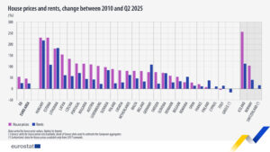 Al comparar el segundo trimestre de 2025 con el de 2010, los precios de la vivienda aumentaron más que los alquileres en 21 de los 26 países de la UE con datos disponibles. Los precios de la vivienda se triplicaron con creces en Hungría (+277 %) y Estonia (+250 %), y se duplicaron o superaron el doble en 10 países de la UE: Lituania (+202 %), Letonia (+162 %), Chequia (+155 %), Portugal (+141 %), Bulgaria (+133 %), Austria (+117 %), Luxemburgo (+112 %), Eslovaquia (+105 %), Polonia (+104 %) y Croacia (+102 %). Italia fue el único país donde los precios de la vivienda disminuyeron (-1 %).