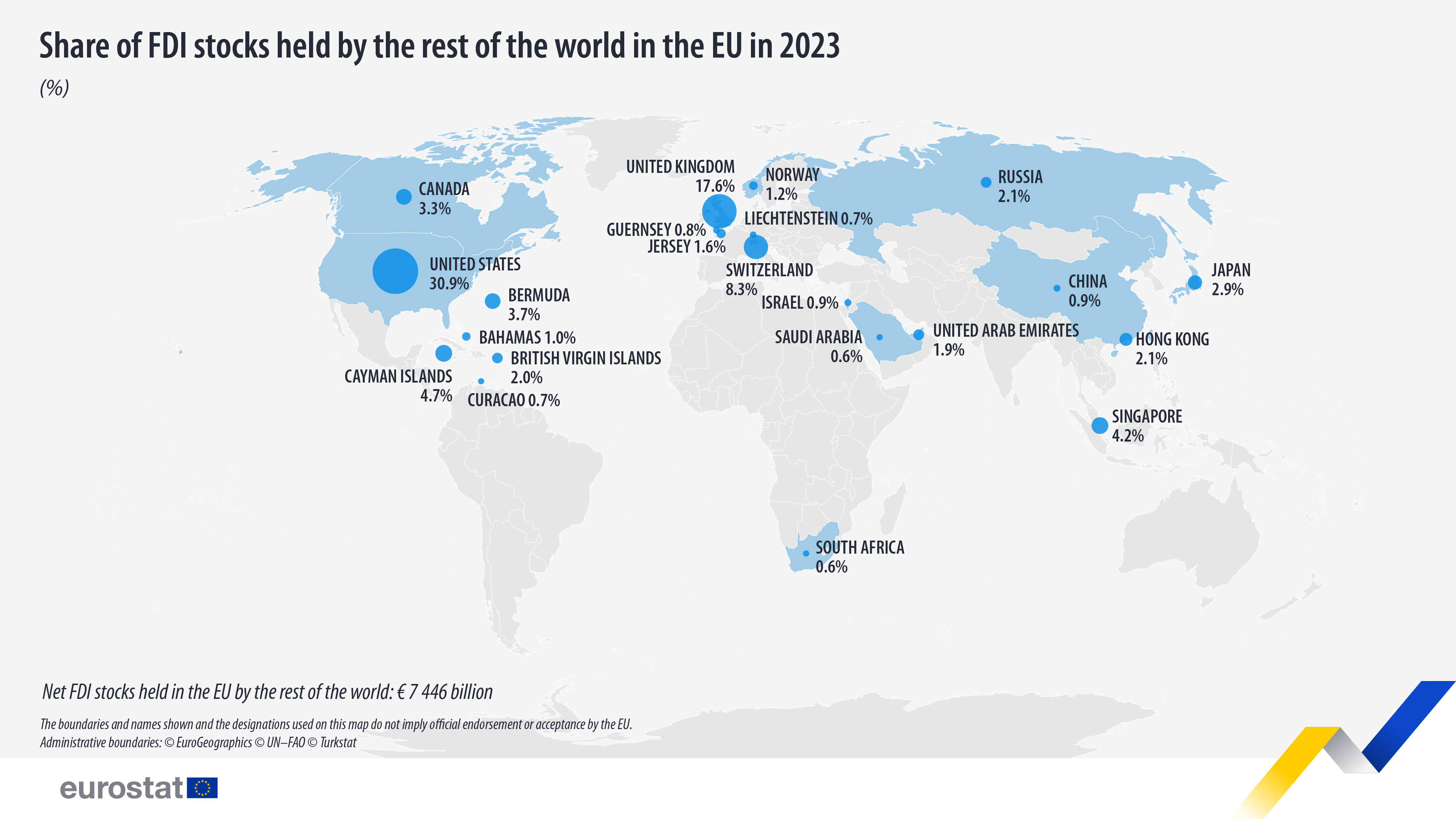 A finales de 2023, Estados Unidos absorbió el 26,6% (2.437 miles de millones de euros) del total de las acciones de IED mantenidas por la UE en el resto del mundo, seguido por el Reino Unido (1.765 miles de euros, 19,3%).