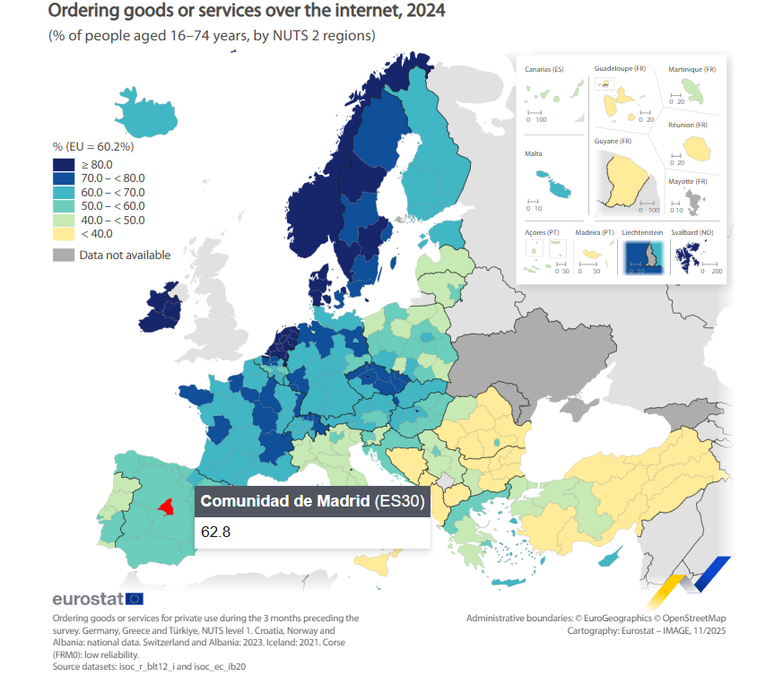 En 2024, había 23 regiones de la UE en el nivel 2 de la nomenclatura de unidades territoriales estadísticas (NUTS 2) donde al menos el 80% de la población de entre 16 y 74 años pidió bienes o servicios a través de Internet en los 3 meses anteriores a la encuesta, según informó hoy Eurostat.