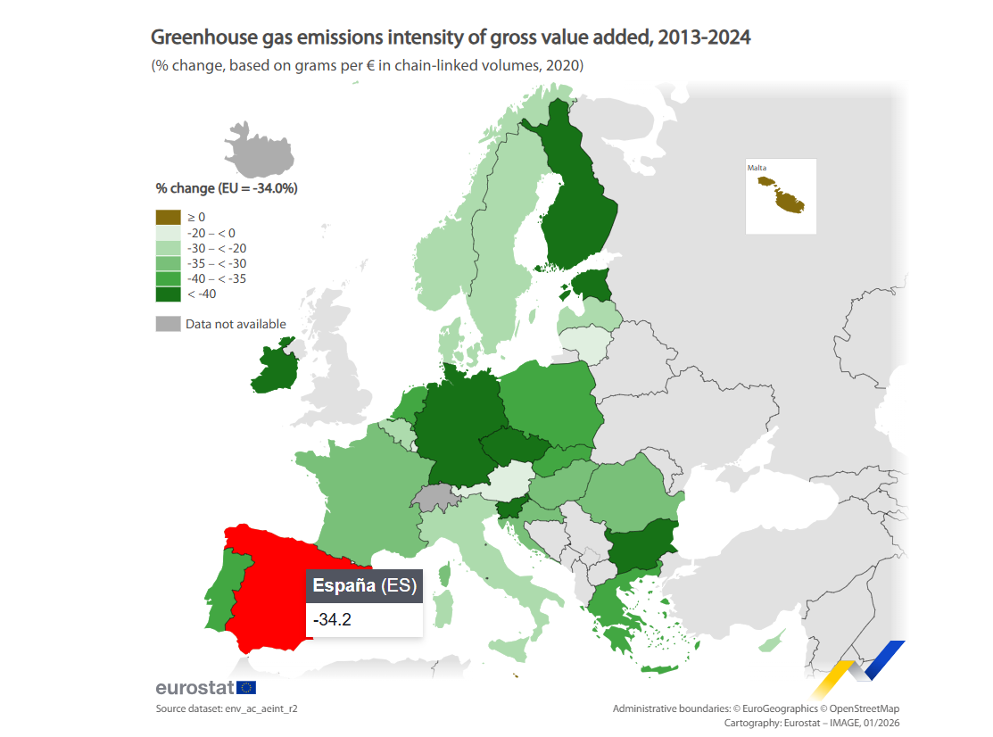 La intensidad de las emisiones de gases de efecto invernadero en la UE disminuyó un 34 % entre 2013 y 2024. Esto se debe a la disminución simultánea de las emisiones de gases de efecto invernadero de la economía de la UE y al aumento de su valor añadido (+20 %). Las mayores reducciones se registraron en Estonia (-64 %), Irlanda (-50 %) y Finlandia (-44 %). Solo Malta (+17 %) vio aumentar su intensidad de emisiones desde 2013.