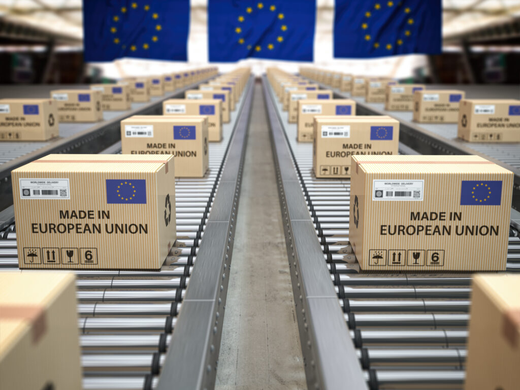 Made in European Union. Cardboard boxes with text made in European Union and EU flag on the roller conveyor. 3d illustration