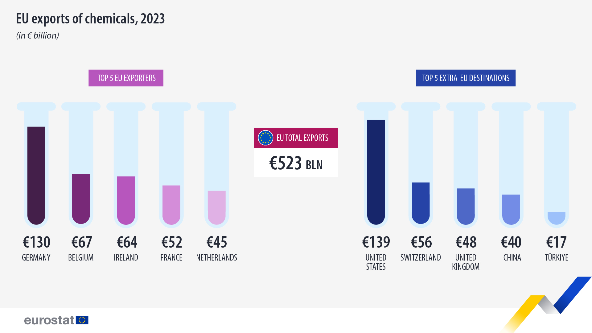 Según los datos de Eurostat, las exportaciones de productos químicos y derivados de la UE disminuyeron a 523 mil millones de euros, una disminución del 5% en comparación con el valor récord de las exportaciones en 2022 (552 mil millones de euros).